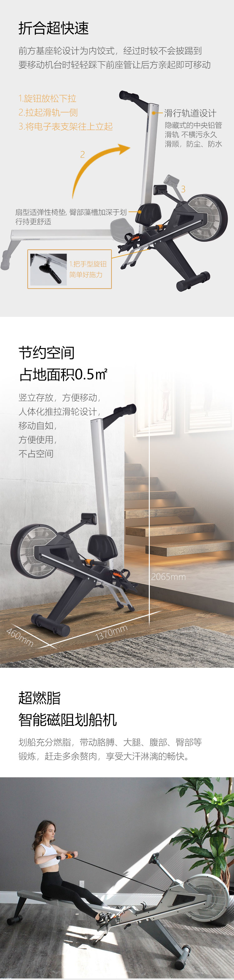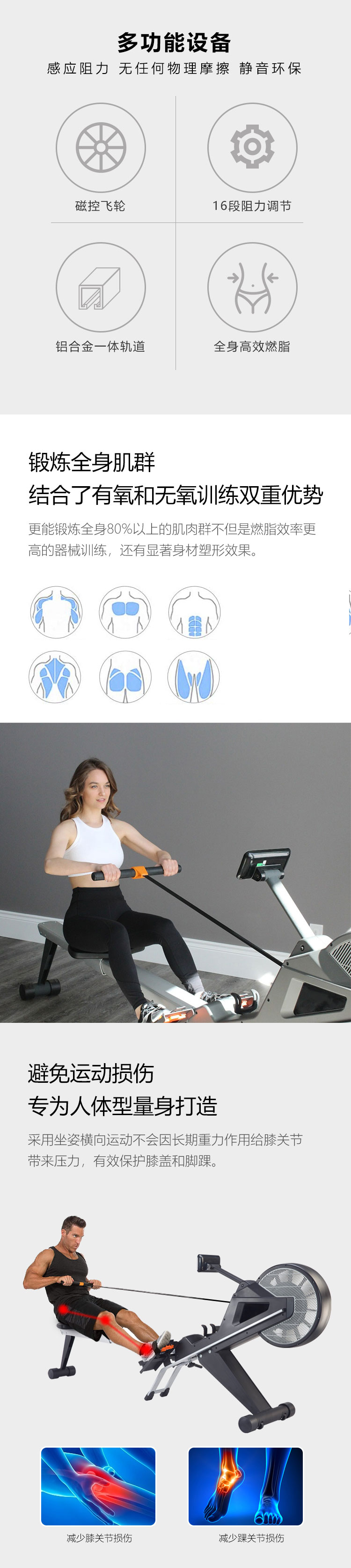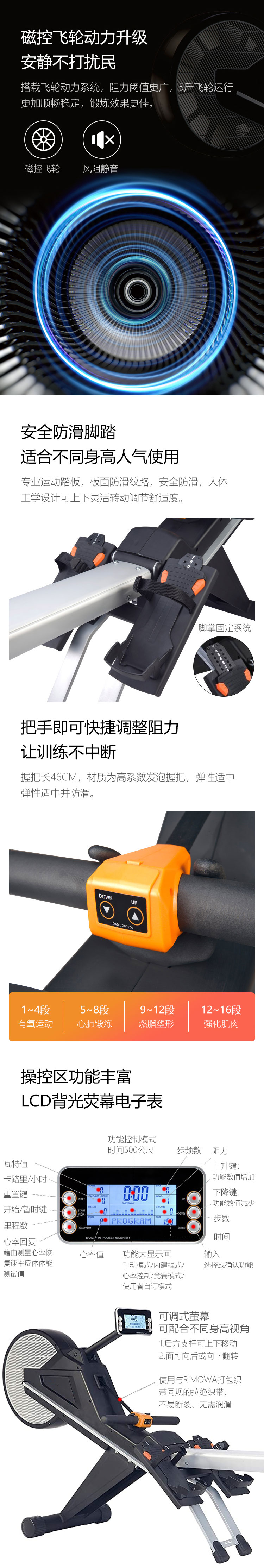 6. 顯示屏:速度、時間、距離、卡路裏、功率、次數/總次數、500米所需時間、心率回複功能、心率控製係統、無線控製係統;