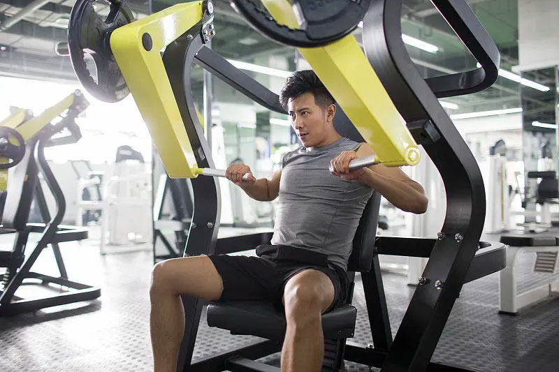2、坐式推胸訓練器:坐式推胸訓練器是一種常見的固定練胸肌器材,鍛煉部位包括:胸大肌,三角肌,肱三頭,肱二頭肌等。操作簡單,安全性高,特別適合初學健身愛好者。