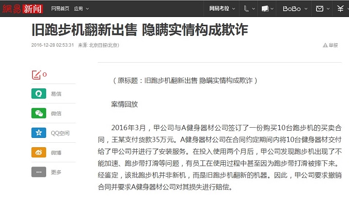 和手機一樣,健身器材當然也有翻新機。把舊的健身器材重新打磨,上漆,更換損壞的配件之後出來的就是新機器。這種現象也時常存在,對於采購一方來說,付了同樣的價格拿到一台舊機器,肯定不會是一件美事。
