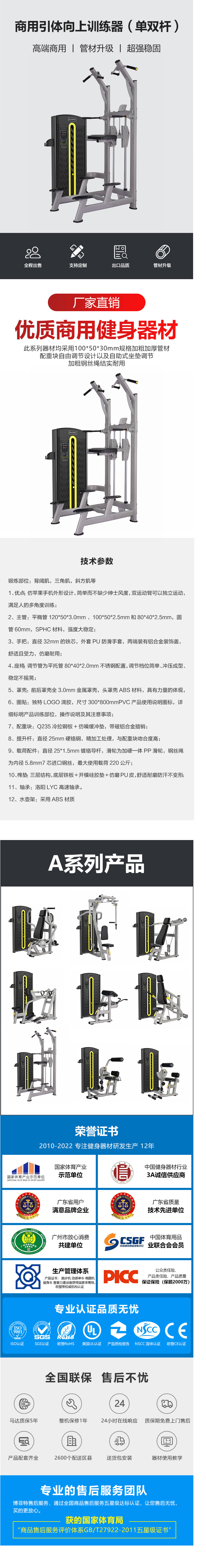 9、載荷配件:直徑25*1.5mm鍍鉻導杆,滑輪為加硬一體PP滑輪,鋼絲繩為內徑5.8mm7芯進口鋼絲,最大使用載荷220公斤;