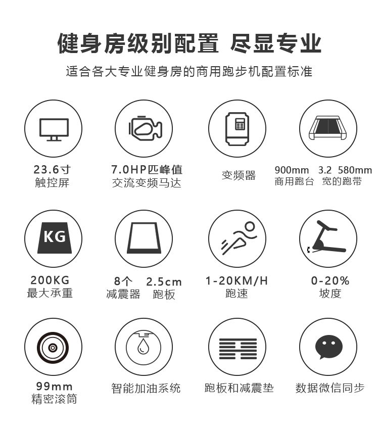 加油係統:手動或者自動加油係統; 跑板厚度:25mm 厚的高強度防靜電跑板; 上邊踏板和側邊踏板:高強度加硬PVC材質,立柱: Q235鋼材; 高加強版的整體鋼架結構提高整體跑步機穩定性